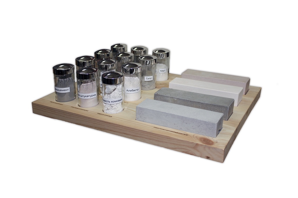 Демонстрационный набор «Производство цемента, извести и гипса» предназначен для изучения технологий получения основных минеральных вяжущих веществ, а также сырьевых и промежуточных материалов, используемых в их производстве. Образцы, входящие в комплект, могут применяться в качестве сравнительных эталонов при выполнении лабораторных работ по дисциплинам, связанным со строительными материалами и технологиями.