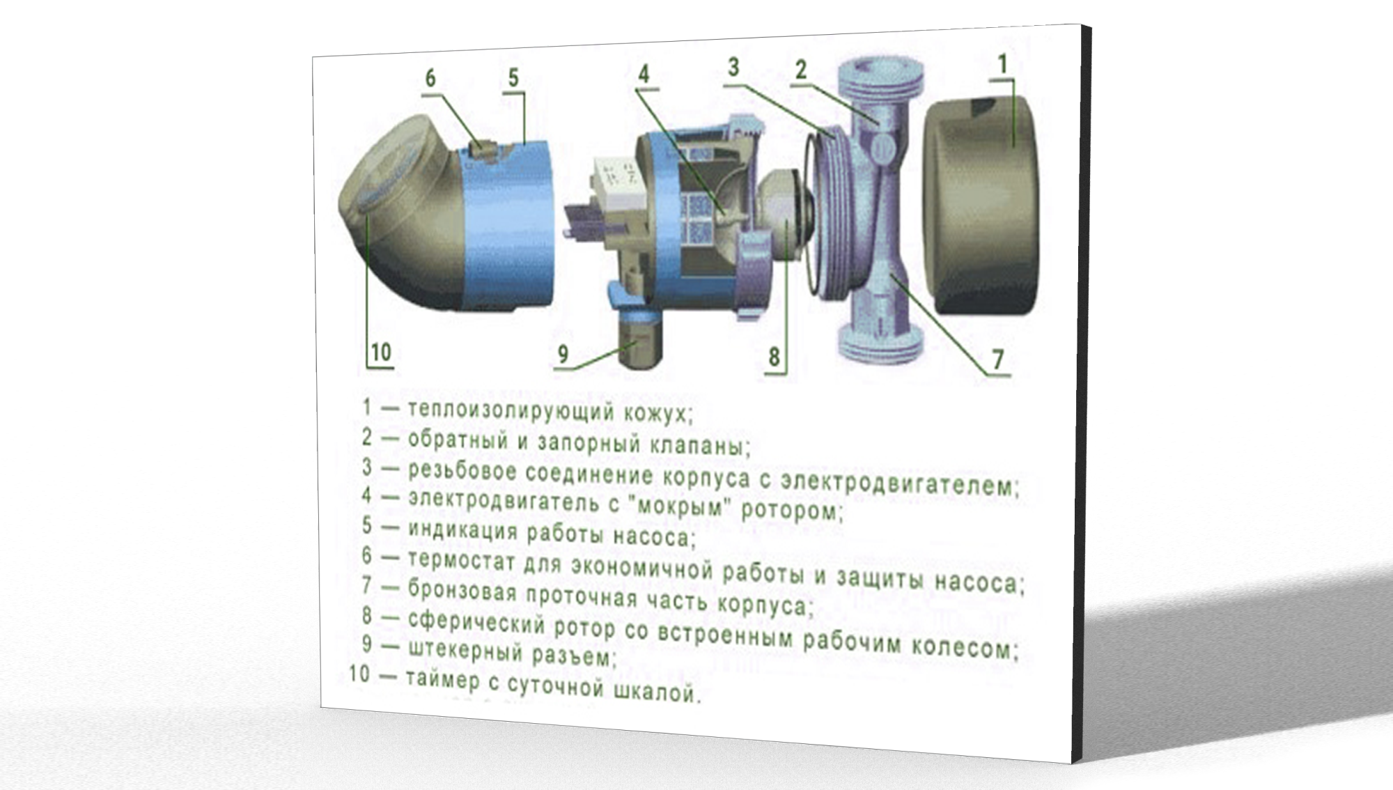 Изделие представляет собой настенный планшет, на котором закреплён насос в разрезе, что позволяет детально рассмотреть его внутреннее устройство. Дополнительно на планшете размещена текстовая и графическая информация, раскрывающая основные технические характеристики, принцип работы и основные области применения циркуляционных насосов.