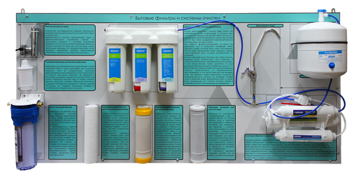 Изделие представляет собой настенный планшет, на котором размещены натурные образцы бытовых фильтров и систем водоочистки, дополненные подробной текстовой и графической информацией, поясняющей их устройство, функциональные особенности и сферы практического использования.