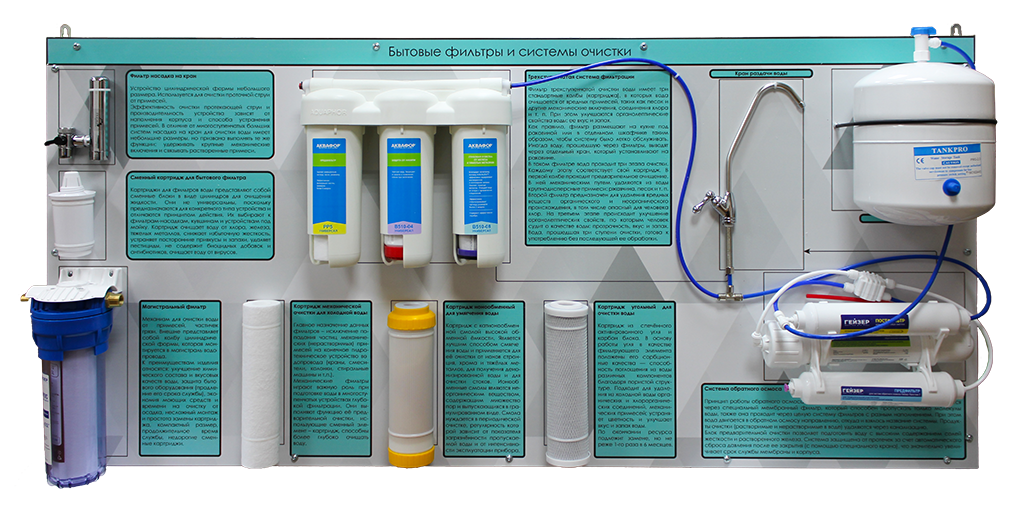 Стенд-планшет «Бытовые фильтры и системы очистки» предназначен для изучения конструкции, принципов монтажа и областей применения различных устройств, используемых для очистки воды в бытовых условиях.